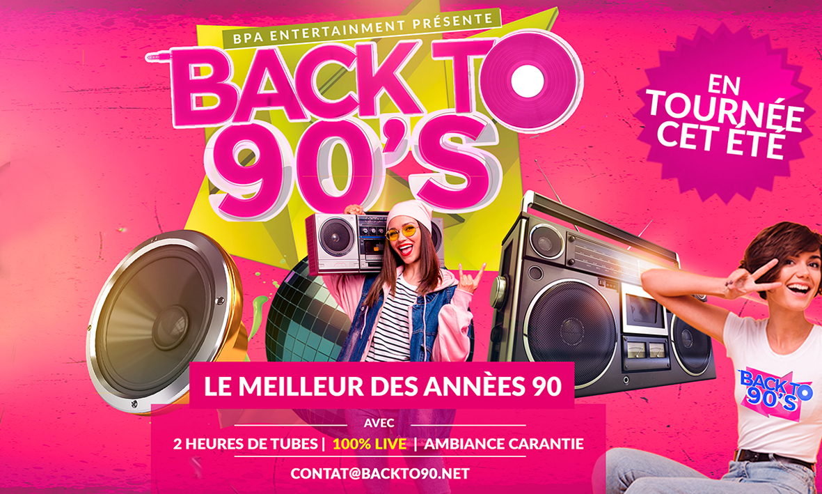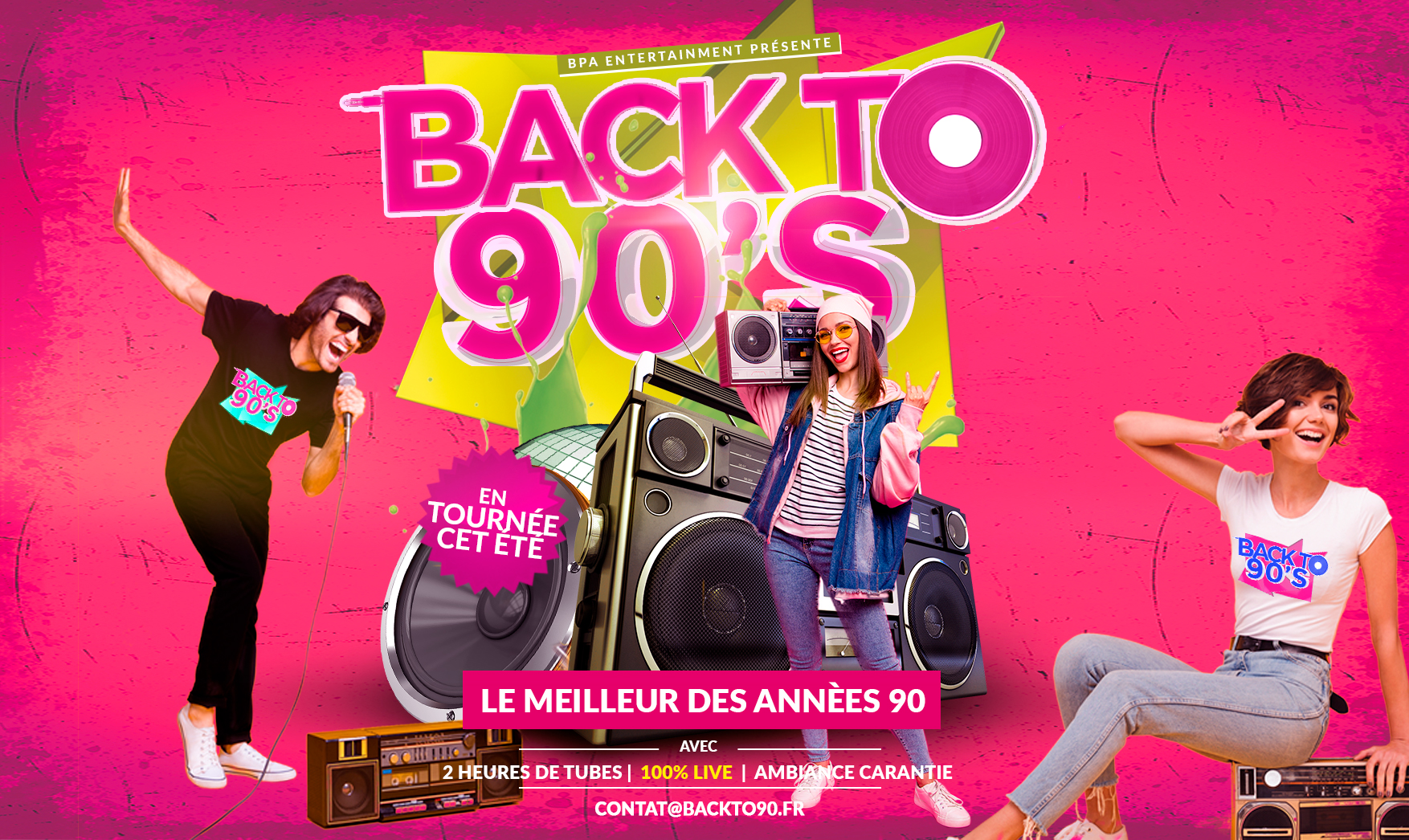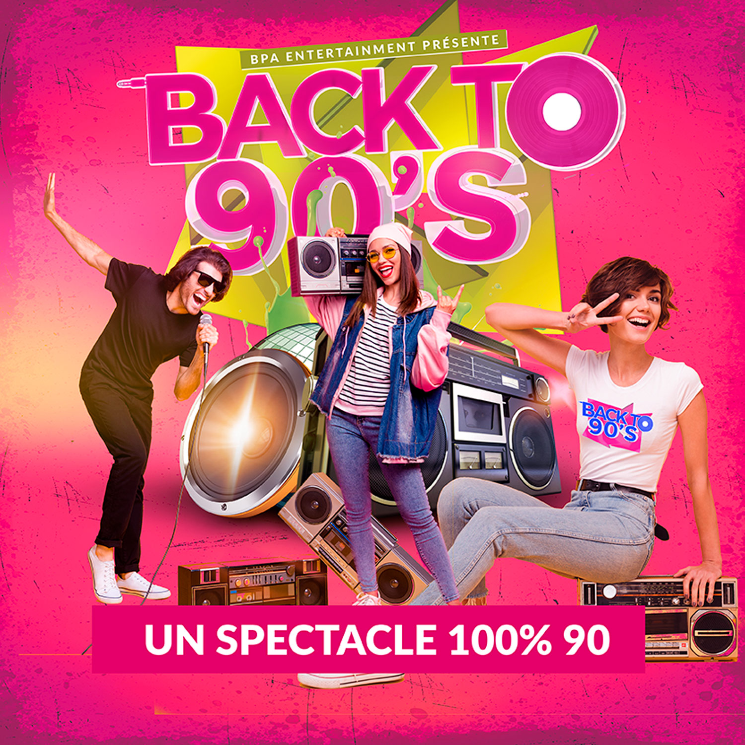 BACK TO 90's! À l’occasion d’un concert inoubliable, remontez dans le temps, bercé par les plus grandes chansons des années 90 qui ont marqué l’histoire de la musique.. Du rock à la pop, en passant par la dance et la variété Française et internationale, Back to 90 vous replonge dans l’ambiance de cette décénie. À bord d’une scène insolite déguisé en Boombox Géant, l’équipe de back to 90 vous replongera à coup sûr dans l’univers des années 90. Un groupe interprétera en live les plus gros hits des 90’s et vous fera replonger le temps d’une soirée dans la plus folle ambiance. 2 heures de concert, 2 heures de tubes avec tout les titres qui ont su marquer cette folle décénie. De Patrick Bruel, Pascal Obispo, Céline Dion, Larusso, Les Boys Band, Zazie, Axelle Red.. aux groupes internationaux tels que U2, Oasis, The Cramberies, sans oublier les incroyables moments qui ont marqué cette génération tel que le «I will survive» de la coupe du monde 98. Tous les tubes incontournables seront au rendez-vous. Flashback et immersion garantis !